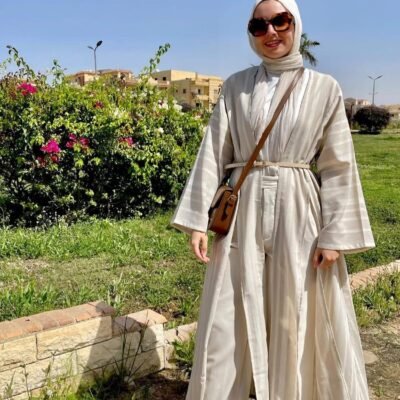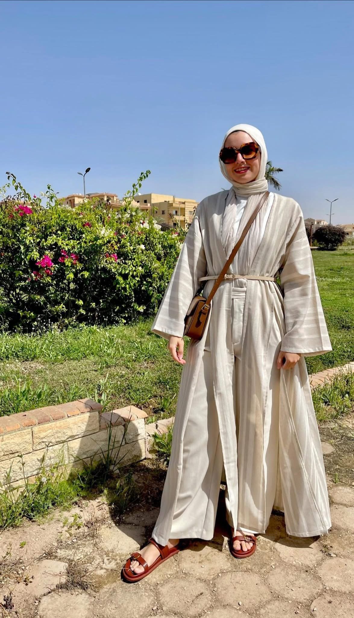 Lightweight striped linen cardigan with wide sleeves and a built-in strap that can be left loose or tied at the waist for two different looks.