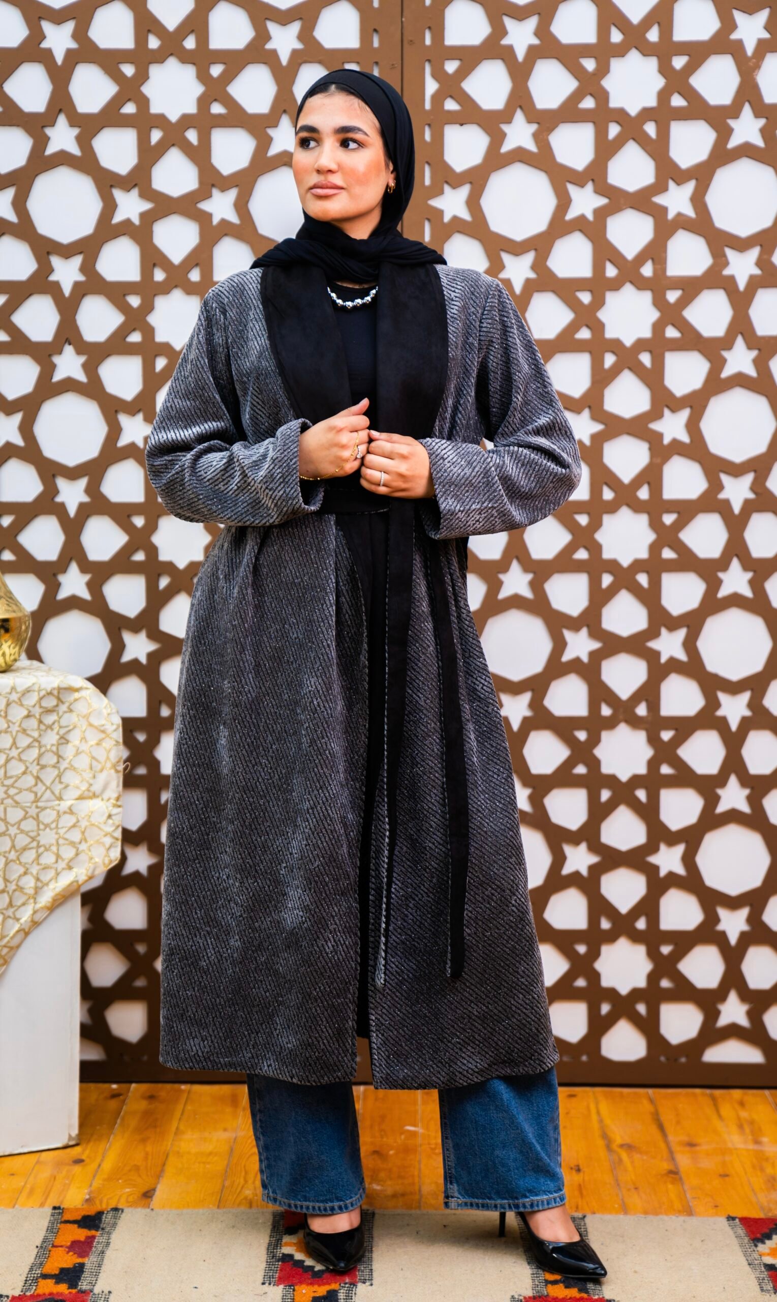 Shimmering long jacket perfect for Ramadan and beyond.